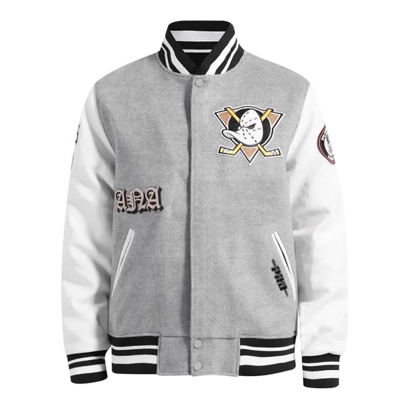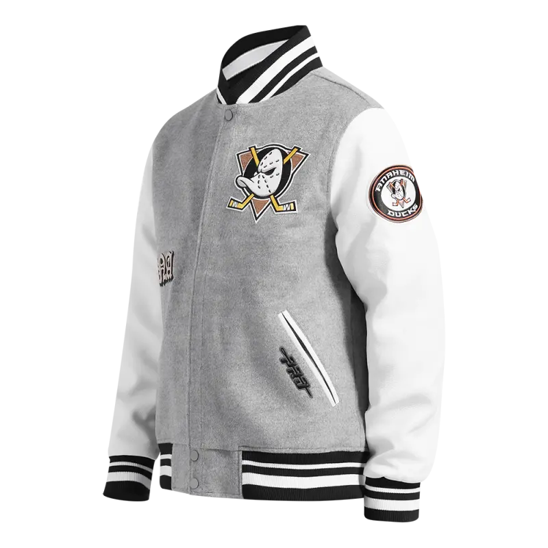 The Pro Standard Premium NHL Anaheim Ducks Old English Men’s Rib Wool Varsity Jacket (Black/Orange)