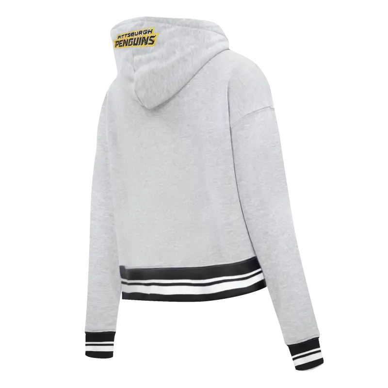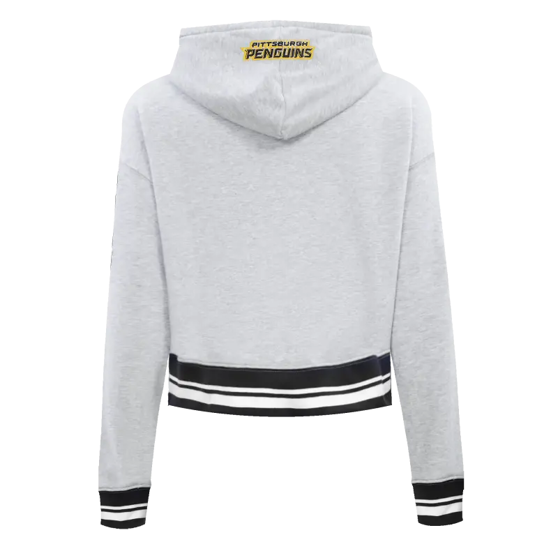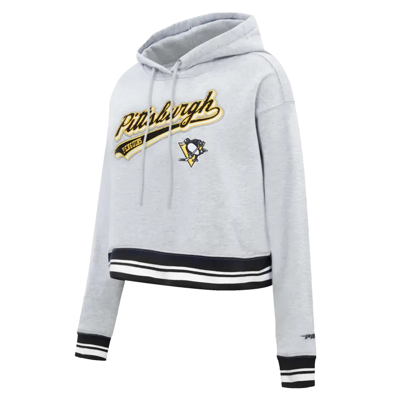 NHL PITTSBURGH PENGUINS SCRIPT TAIL WOMEN’S RIB FLEECE CROPPED PULLOVER HOODIE (HEATHER GRAY\/BLACK)